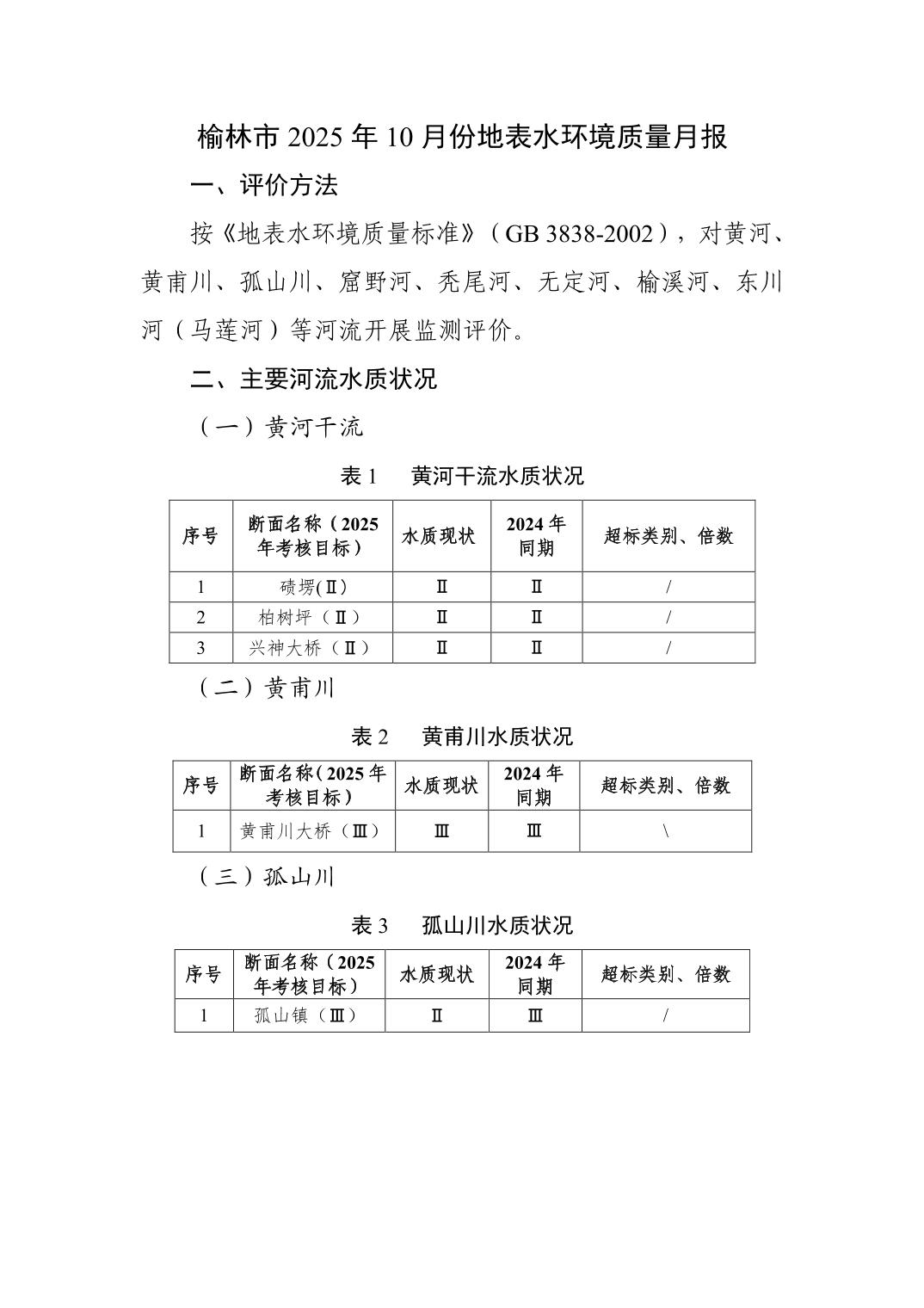 榆林市2025年10月份地表水环境质量月报