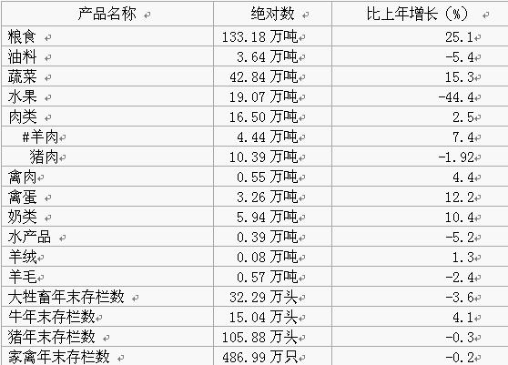 粮食生产喜获丰收,粮食总产量再创新高,达到133.18万吨,比上年增长25.1%。玉米、马铃薯、小杂粮百、千、万亩集中连片单产再创全国最高纪录,油料、水果产量有所下降。