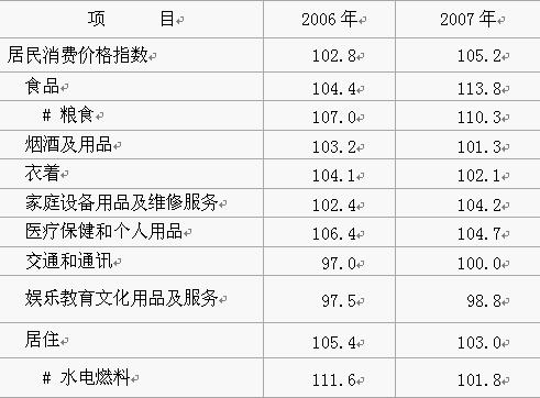 市场物价上涨较快。2007年居民消费价格指数比上年上升5.2%,其中,食品类上涨13.8%;商品零售价格指数上涨5.3%;农业生产资料价格指数上涨8.6%。