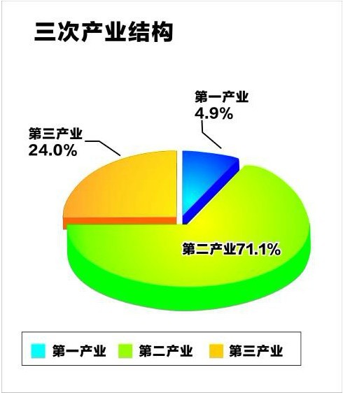 初步核算,全市实现生产总值2292.26亿元,比上年增长15.0%,增幅比上年回落3.3个百分点。其中,第一产业增加值111.91亿元,增长6.0%;第二产业增加值1629.66亿元,增长16.3%;第三产业增加值550.68亿元,增长13.5%。三次产业结构之比为4.9∶71.1∶24.0。人均生产总值68358元。非公有制经济增加值828.49亿元,占生产总值的36.1%。