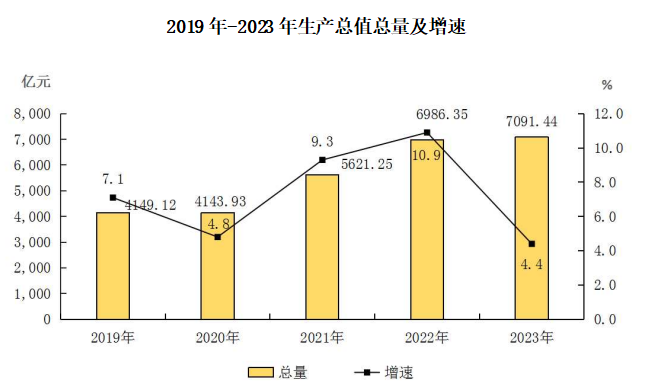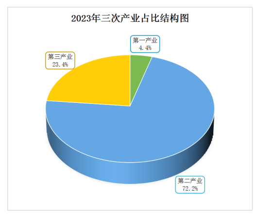 初步核算,2023年全市实现地区生产总值7091.44亿元,比上年增长4.4%,其中第一产业增加值314.54亿元,增长3.8%;第二产业增加值5118.36亿元,增长5.1%;第三产业增加值1658.54亿元,增长2.9%。一、二、三产业增加值占生产总值的比重分别为4.4%、72.2%和23.4%。按常住人口计算,人均生产总值196346元。
