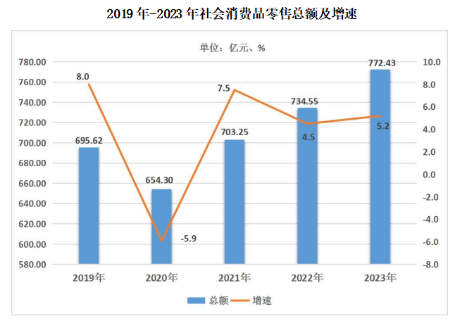 2023年,全市社会消费品零售总额772.43亿元,比上年增长5.2%。从经营地看,城镇消费品零售额558.33亿元,增长5.5%,乡村消费品零售额214.1亿元,增长4.4%。从消费类型看,商品零售689.21亿元,增长4%,餐饮收入83.22亿元,增长16.3%。